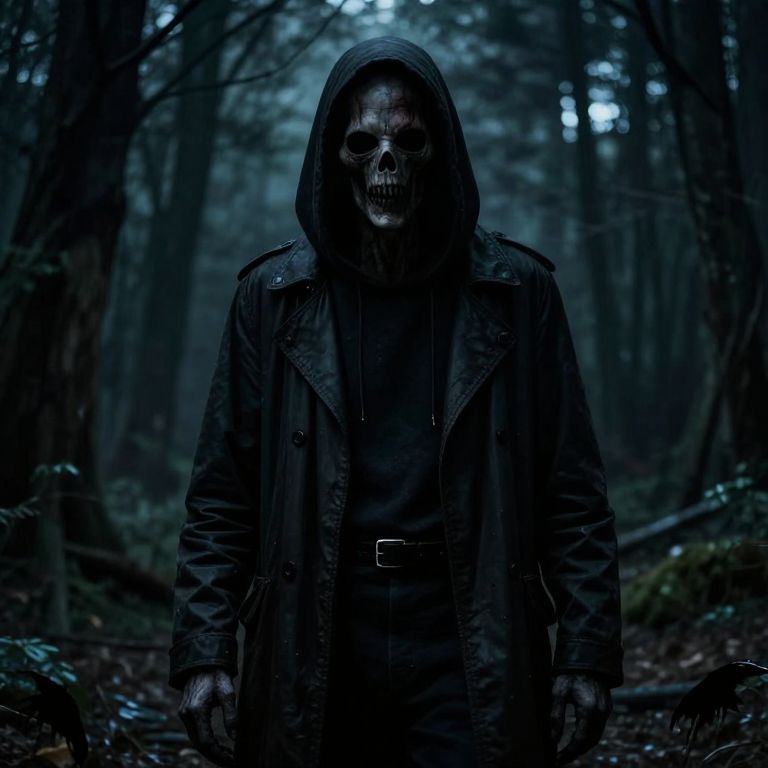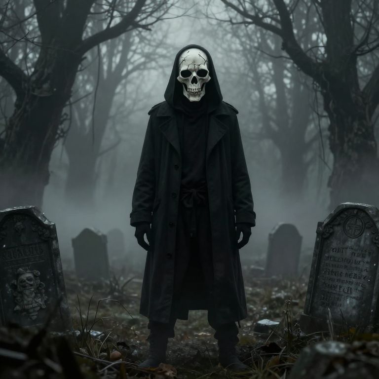 Boneface character standing in foggy graveyard, glowing eyes piercing through cracked skull mask, eerie atmosphere with twisted trees and ancient tombstones, dark fantasy style, muted color palette, high contrast shadows creating mysterious vibe