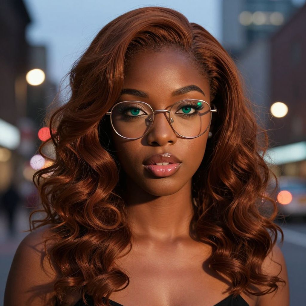 Craft a photorealistic portrait of an enchanting young African woman with cascading chestnut waves framing her flawless porcelain skin. Fine lines grace her captivating emerald eyes and full lips adorned with a hint of pink gloss. Standing amidst the vibrant cityscape at dusk, she exudes an air of mystery as warm streetlights cast long shadows across her face while reflecting off her delicate glasses. This intricate digital artwork captures both the awe-inspiring metropolis and the intimate allure of this mesmerizing subject, seamlessly blending wonderment and introspection.