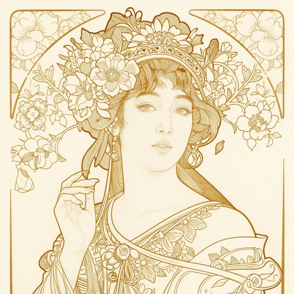 This is a detailed, monochromatic line drawing in a vintage Art Nouveau style. The image depicts a young woman with delicate features and a serene expression, adorned with a floral crown that cascades around her head. She has wavy hair peeking out from under the crown and is gently holding one side with her right hand. Her attire features intricate floral patterns, matching the crown. The background is filled with more floral motifs, creating a harmonious, nature-inspired theme. The drawing is framed with a subtle arch at the top, enhancing the elegant and timeless feel of the artwork. The entire image is rendered in sepia tones, adding a warm, antique quality.