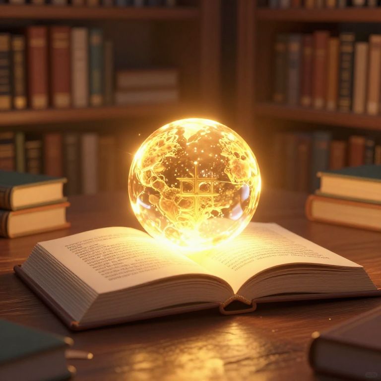 Photograph of an open book on a wooden table, illuminated by a glowing, translucent, golden orb resembling a crystal globe, with light patterns resembling continents. The book's pages are slightly yellowed, with text visible. Background features a blurred library with bookshelves filled with variously colored books. Two closed books are stacked on the left, and another partially visible on the right. The warm light from the orb casts a soft, golden glow over the scene, creating a mystical, enchanting atmosphere. The image emphasizes a blend of knowledge and magic.