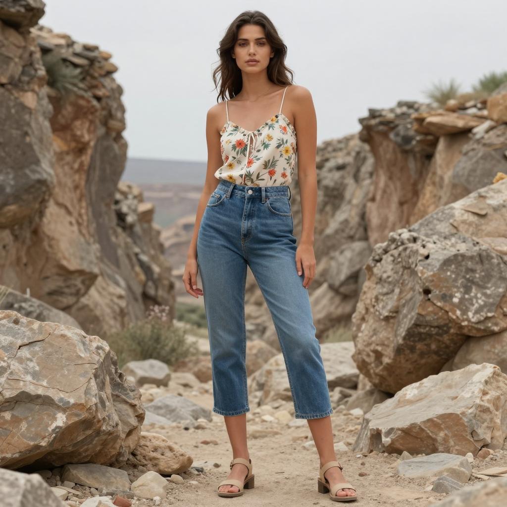 A woman with medium-length brown hair wearing a casual outfit of a blue denim shirt and ripped blue jeans. She is standing in a sunlit indoor hallway with hands in her pockets. The hallway features arched doorways, potted plants, and wooden furniture. She wears brown leather shoes and has a confident, relaxed expression.