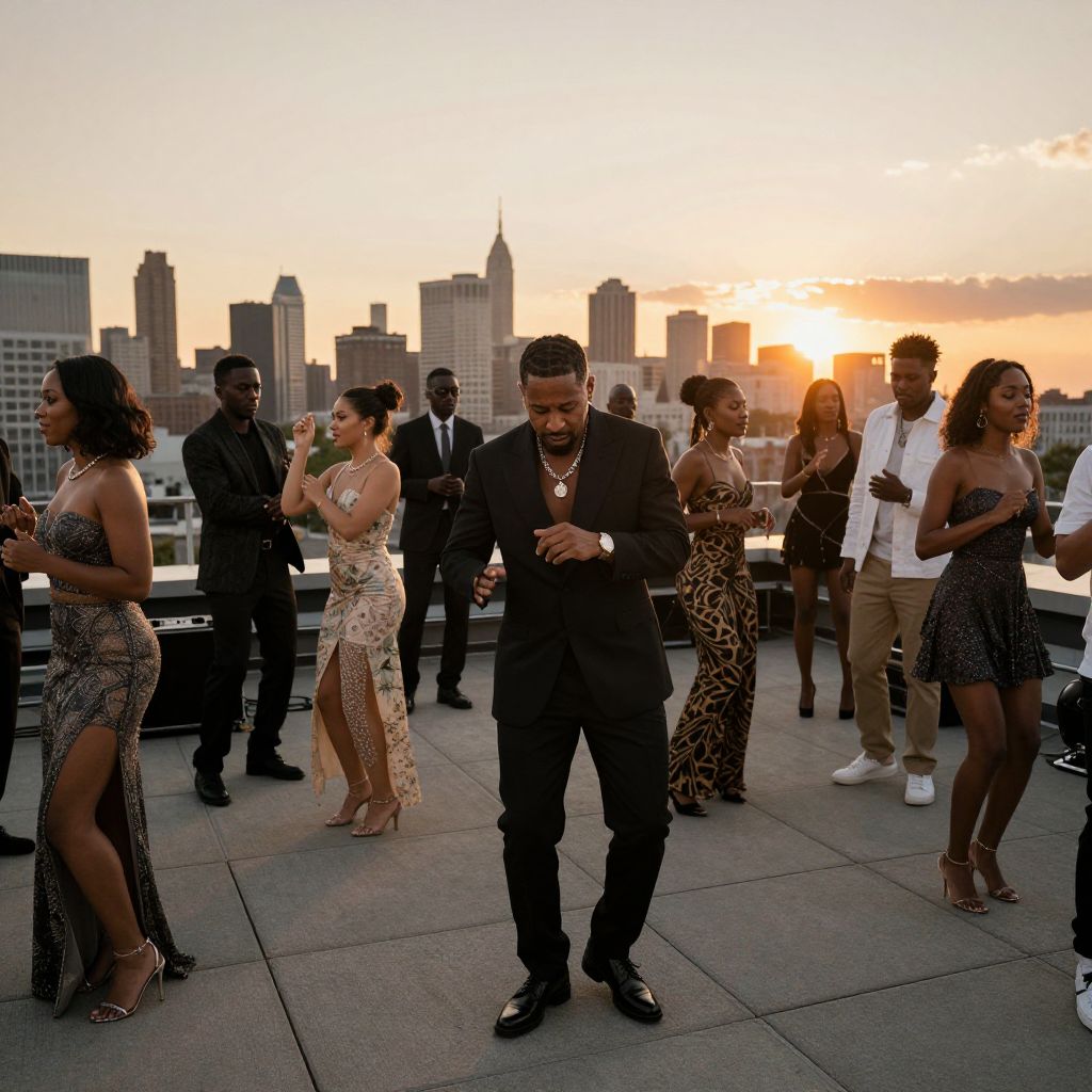 Usher's urban rooftop party at sunset with stylish guests dancing to soulful music, panoramic cityscape background, warm golden hour lighting, elegant streetwear fashion, lively atmosphere, cinematic composition