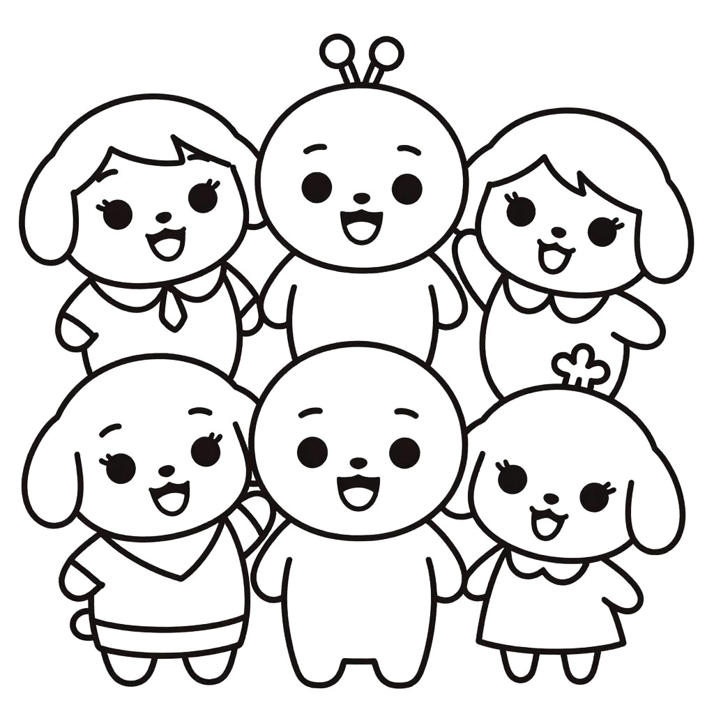 A black-and-white digital line drawing of seven adorable, cartoon-style anthropomorphic dog characters with large, round eyes and simple, rounded shapes. Each dog has a unique hairstyle and expression, with some smiling and others with slight grins. They are arranged closely together, filling the entire frame, with no background details. The dogs have floppy ears, some with small pigtails, and are dressed in simple, unadorned clothing. The overall style is cute and minimalist, emphasizing the charming, child-like appearance of the characters.