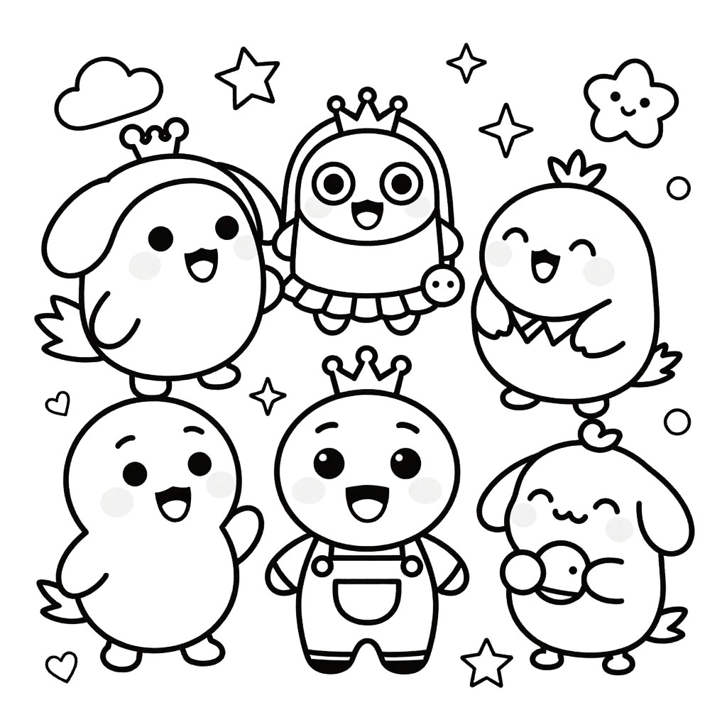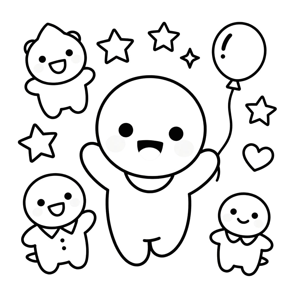 Cute Pixar coloring pages featuring adorable animated characters in playful poses, big expressive eyes, and friendly smiles, set against simple backgrounds with fun shapes and patterns, rendered in a clean line art style perfect for children to color.