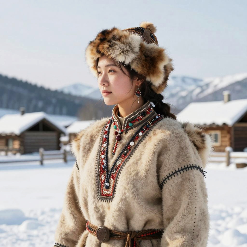 Ancient Sami clothing depicted with focus on practical and decorative elements, soft furs and thick wools, detailed stitching and beadwork, headwear made of natural materials, set in a serene snow-covered mountain village under clear sky