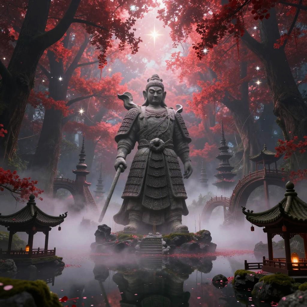 A enormous stone samurai warrior emerging from mist set within crimson forest glades shrouded in hanging bloom petals, wrapped in ethereal mist and drifting incense, glowing stars scattered above, a celestial vault painted with dusky pinks and reds blending into smoky twilight. Tranquil waters mirror the heavens, distant spires and bridges on rocky arches, lantern-lit sanctuaries and mossy terraces, a serene dreamlike atmosphere with surreal, intricate details; cinematic composition, volumetric fog and light rays, hyper-detailed textures, high dynamic range, wide-angle vista, depth of field, soft rim light, subtle film grain, epic scale.