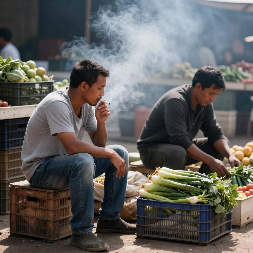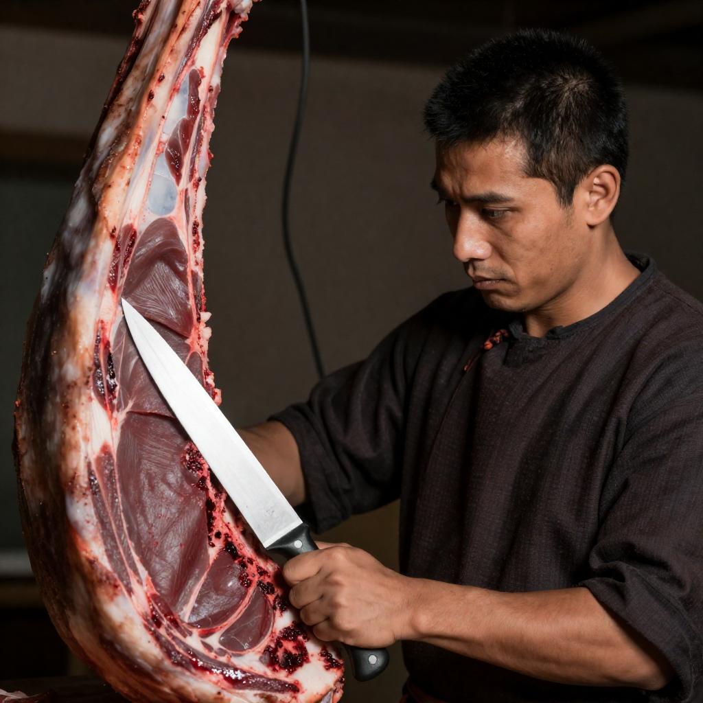 Photograph of a dark-haired man with a serious expression, wearing a dark, ured robe, carving a large, bloody piece of meat with a white knife. The background is dimly lit with cables visible. His focused gaze is directed at the meat, which occupies the left side of the frame.