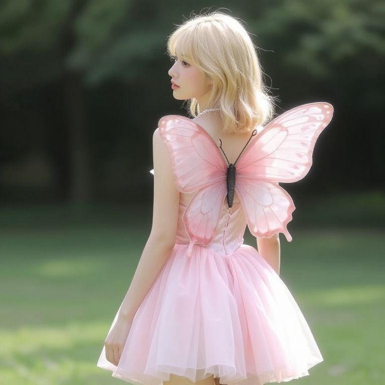 Girl with blonde hair wearing a pink dress with a butterfly wings on her back.