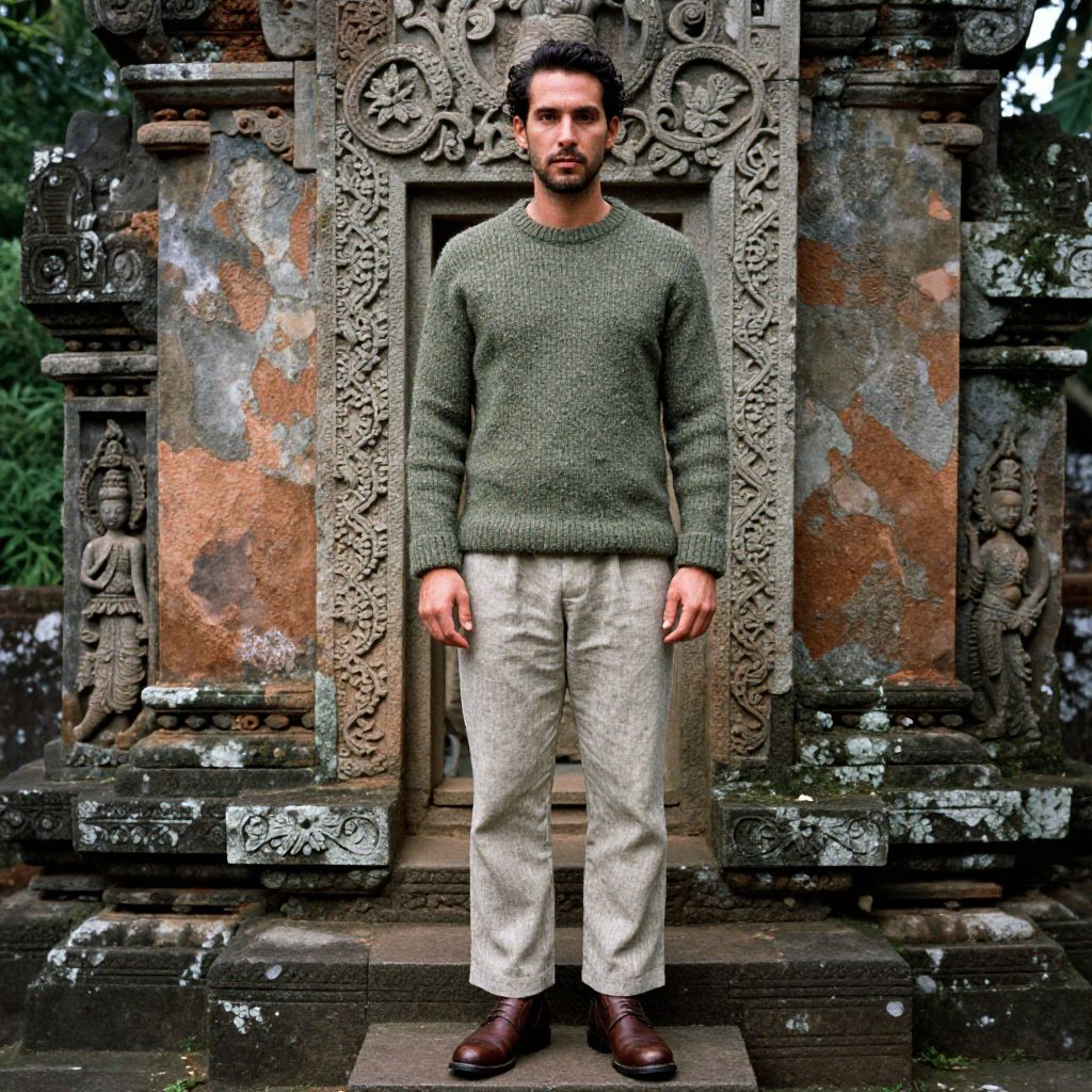 A man, reclaimed wool pullover in earthy green, hemp trousers in light beige, brown leather boots, casual and eco-friendly style, ancient stone temple, intricate carvings, surrounded by lush greenery, ektachrome film stock, serene expression. Man has masculine face and piercing eyes