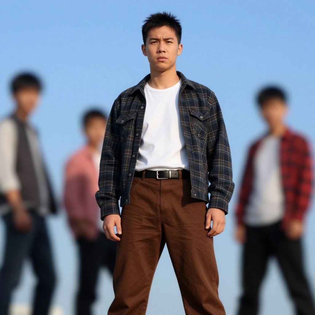 Frankie goes hollywood, male focus, jacket, plaid shirt, multiple boys, outdoors, pants, shirt, blue sky, day, sky, 2boys, standing, looking at viewer, realistic, blurry background, parody, brown pants, 1boy, blurry, asian