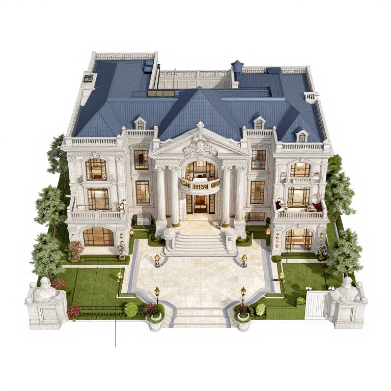 Mansion floor plan generator visualization, birds-eye view of an elaborate luxury estate floor plan with spacious living areas, grand entrance, multiple bedrooms, detailed annotations, blend of classical and contemporary architectural elements, high detail, vector art style