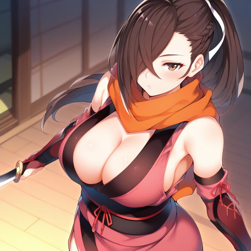 Hana (fire emblem), fire emblem, 1girl, brown eyes, brown hair, long hair, japanese clothes, katana, headband, by artist lpip, illustrious