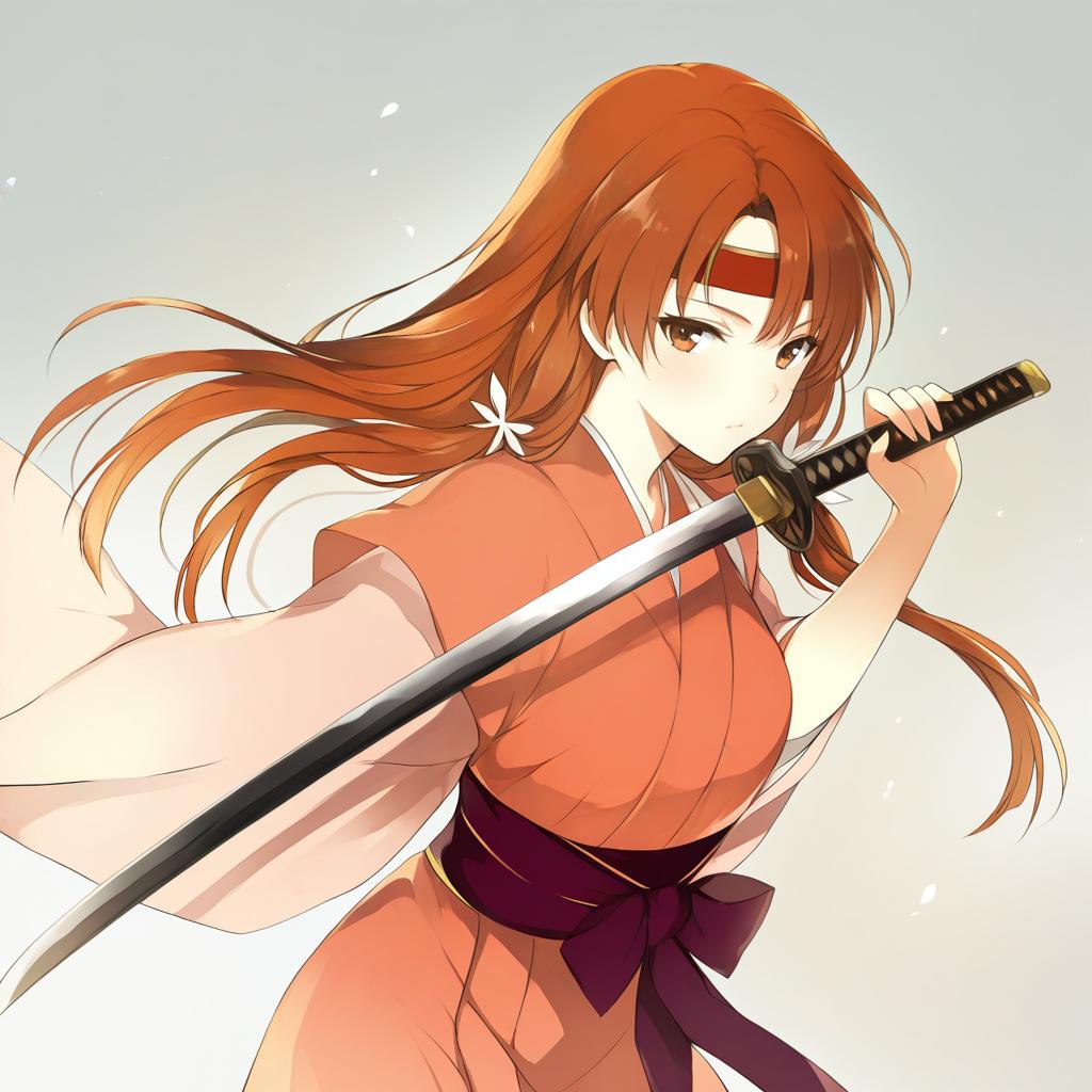 Digital illustration of a young anime girl with long brown hair and brown eyes, dressed in traditional Japanese attire. She wears a red headband and holds a katana sword in a poised stance. The artwork features soft shading and a light background, emphasizing the character's calm yet determined expression.