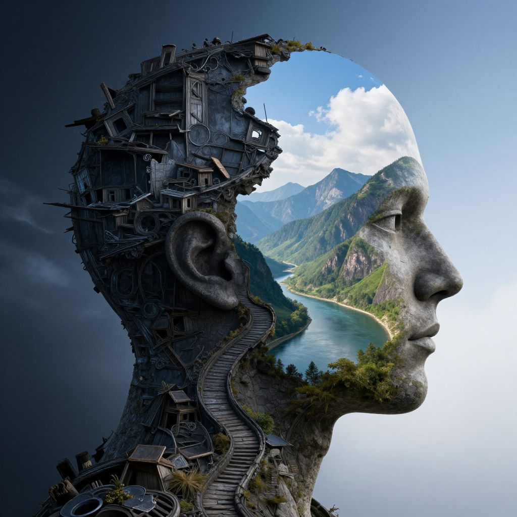 Digital artwork of a profiled human head with one side containing a detailed, floating village and the other side showcasing a scenic mountain lake. Fantastical