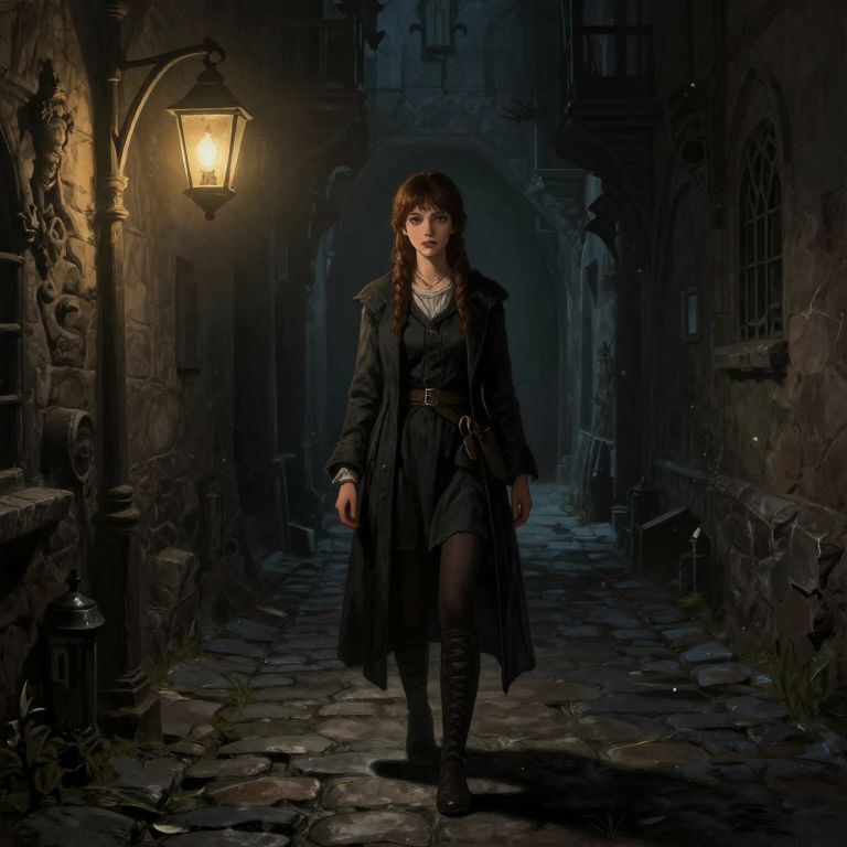 Amicia, in a shadowy medieval alley, cautious and alert, dim lantern light casting long shadows, cobblestone street details, subtle hints of magic in the air, dark and moody atmosphere, highly detailed digital painting style.