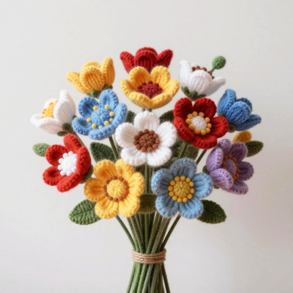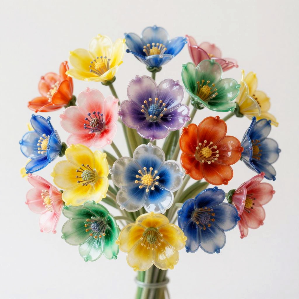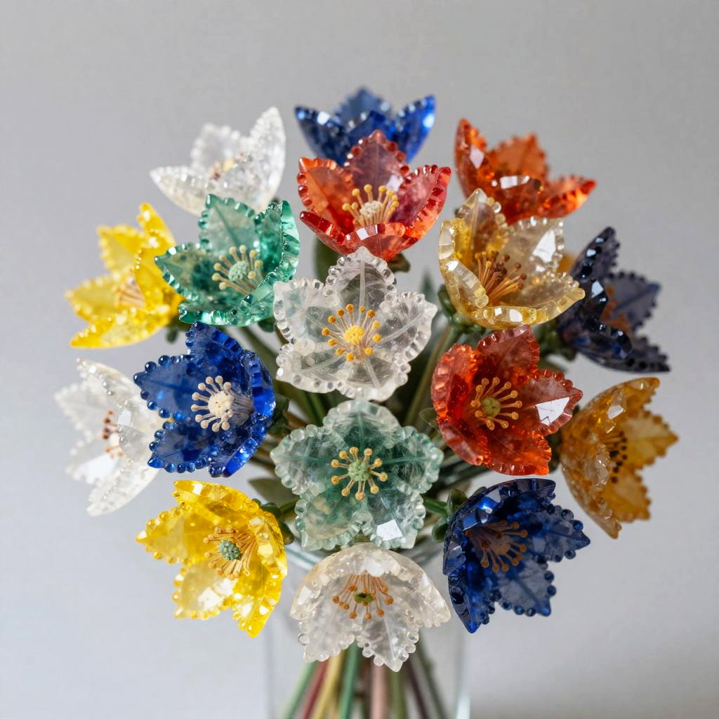 A beautiful bouquet of flowers made entirely of lava rock, with clear contours and intricate details. The bouquet is brightly colored with a unique, original design, and rendered with hyperrealistic clarity. The composition features vibrant tones and precise detailing, making each flower appear delicate yet striking.