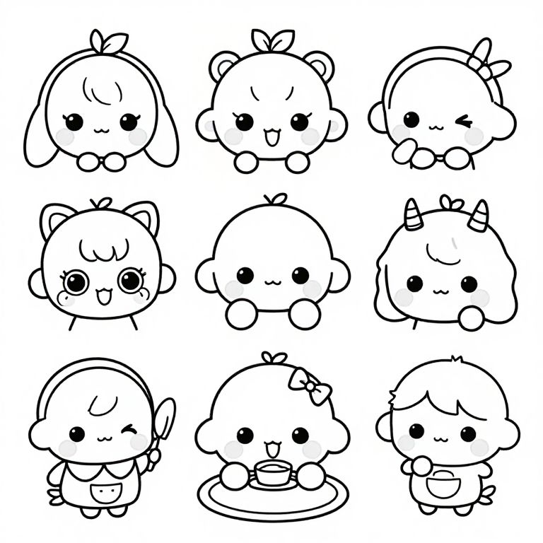 Chibi kawaii anime coloring pages depicting lovable miniature anime characters with exaggerated facial expressions, whimsical accessories, and cozy scenes, all in simple and clear black-and-white line art to inspire artistic creativity.