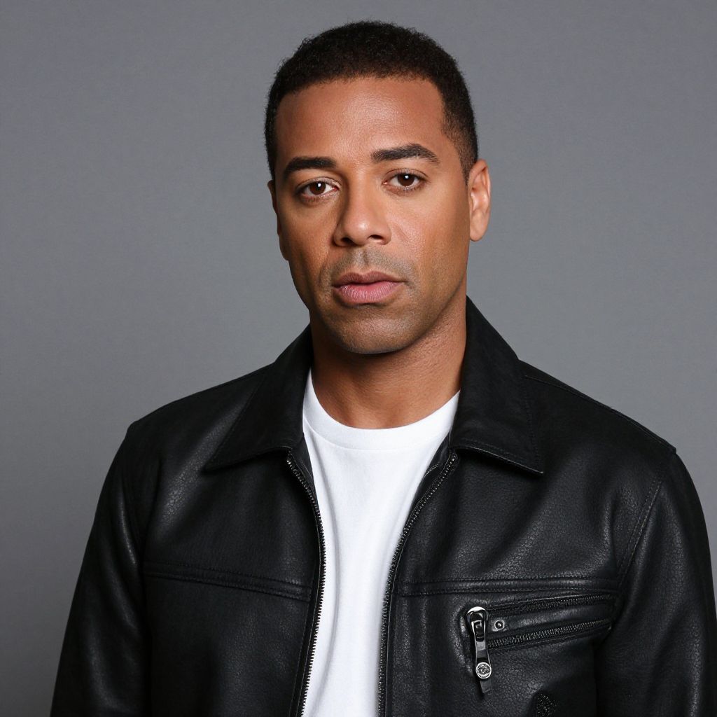 Photograph of a young Black man with short curly hair, wearing a black denim jacket over a white t-shirt, against a plain gray background. He