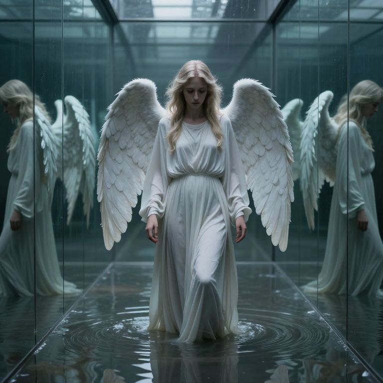 Photograph of a pale-skinned, blonde-haired woman with large, white, feathered wings, dressed in a flowing, white, long-sleeved gown. She walks through a dark, reflective room with glass walls, creating multiple mirrored reflections of herself. The floor is wet, causing ripples around her feet. Her expression is solemn, and the lighting is cool and moody, casting shadows that enhance the ethereal, angelic atmosphere. The image has a fantasy, surreal quality, emphasizing her divine, otherworldly presence.