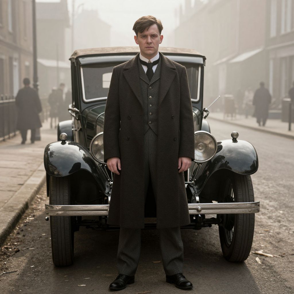 Gentlemans in a vintage 1920s setting, dressed in tailored suits with pocket watches, standing beside classic cars on a cobblestone street, soft warm lighting, cinematic depth of field, highly detailed textures