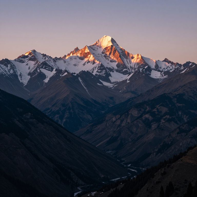 Photograph of a snow-capped mountain peak bathed in sunset light, with dark, shadowy valleys in the foreground and a clear, pastel