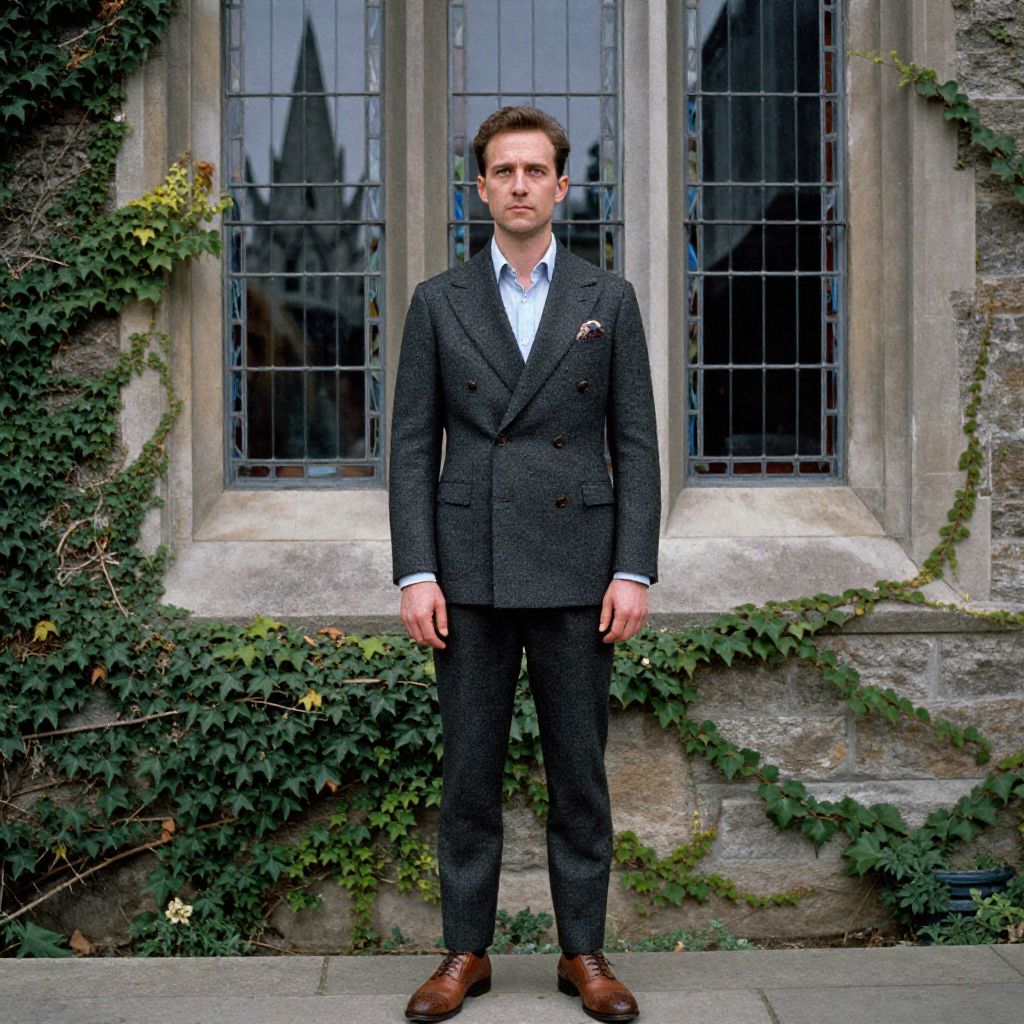 A man, charcoal grey tweed suit, double-breasted jacket, tapered trousers, light blue linen dress shirt, patterned silk pocket square, brown leather brogues, gothic spires, stained glass windows, ivy-covered stone walls, kodak sp analog photo, contemplative expression. Man has masculine face and piercing eyes