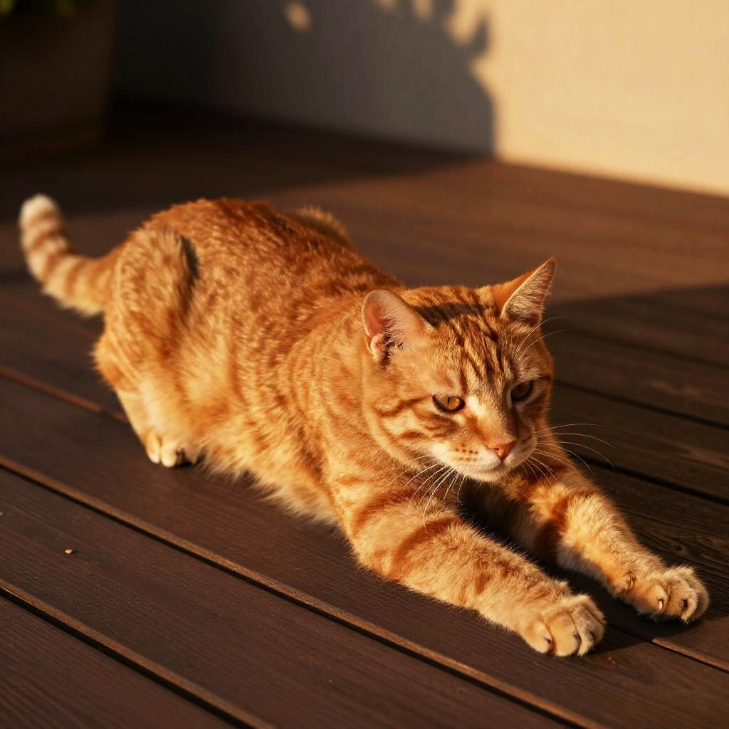 Realistic cat pictures showing a ginger cat stretching on a wooden deck at golden hour, rich color tones, highly detailed fur patterns, crispy shadows from the setting sun, hyper-realistic outdoor scene