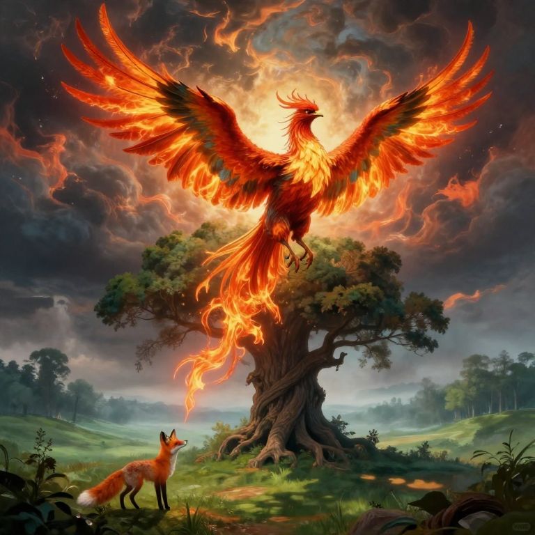 Digital illustration of a vibrant, red phoenix with outstretched wings rising from a blazing fire at sunset, surrounded by dark pine trees and grassy terrain