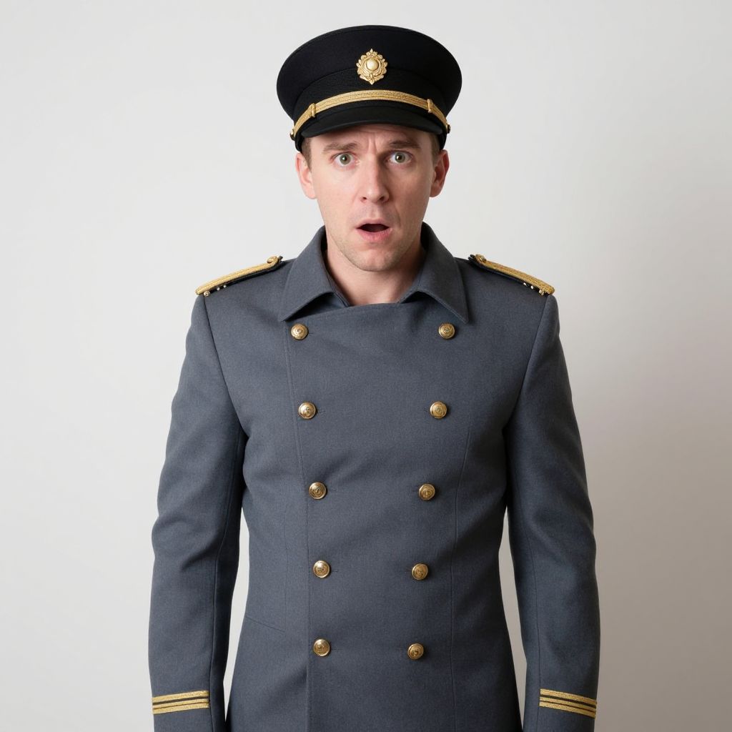 Photograph of a young Caucasian man with fair skin and short brown hair, wearing a dark navy blue naval officer uniform with gold buttons, epaulettes, and a black peaked cap with a gold emblem. His expression is surprised, with wide eyes and an open mouth. The uniform has gold stripes on the sleeves. The background is plain white, making the subject stand out. The image has a slight studio lighting effect, emphasizing the uniform's texture and the man's expression.