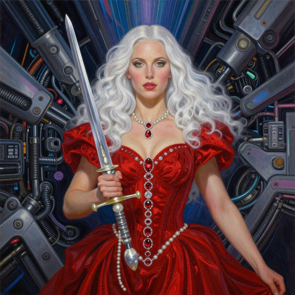 Imbue the image with visions of hope, wonderment, and majestic majesty., and the language of a woman in a red dress, with lips and green eyes eyes, and white, long white wavy hair of the man and mother-of-pearl, holding a pearl sword & a dress made of rubies with diamonds, very high-quality by chris rahn, oil painting, highly detailed, rich palette, masterpiece, cyberpunk color palette, mechanical colours, cinematic atmosphere, hyperdetailed, ultra realism, hyperrealistic, photorealism, 4 k u(hd:1.1), (hd:1.1), high quality, rendered by brom, alan lee, albert bierstadt, oversized realistic, peter maxime des seen from the matrix, beautiful, symmetrical, holography space horror art in unreal engine, smooth shading, luxury, colourful