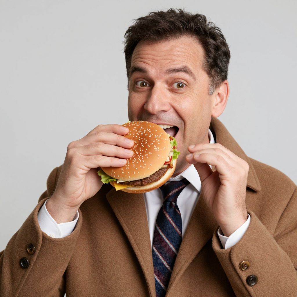 A photograph of a cheerful, middle-aged man with short dark brown hair and fair skin, wearing a brown overcoat, white shirt, and striped tie. He's holding a large, sesame seed hamburger close to his face, smiling widely. The background is a plain light gray, making him and the burger the focus of the image. His expression and posture suggest he's excited about eating the burger.
