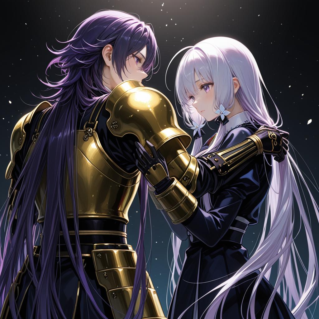 Illustration of a female anime warrior with long purple hair wearing detailed gold armor and black gloves. She has purple eyes and white floral hair accessories. The background is dark with luminous specks resembling stars and a large star-shaped light near her hand, creating a mystical atmosphere.