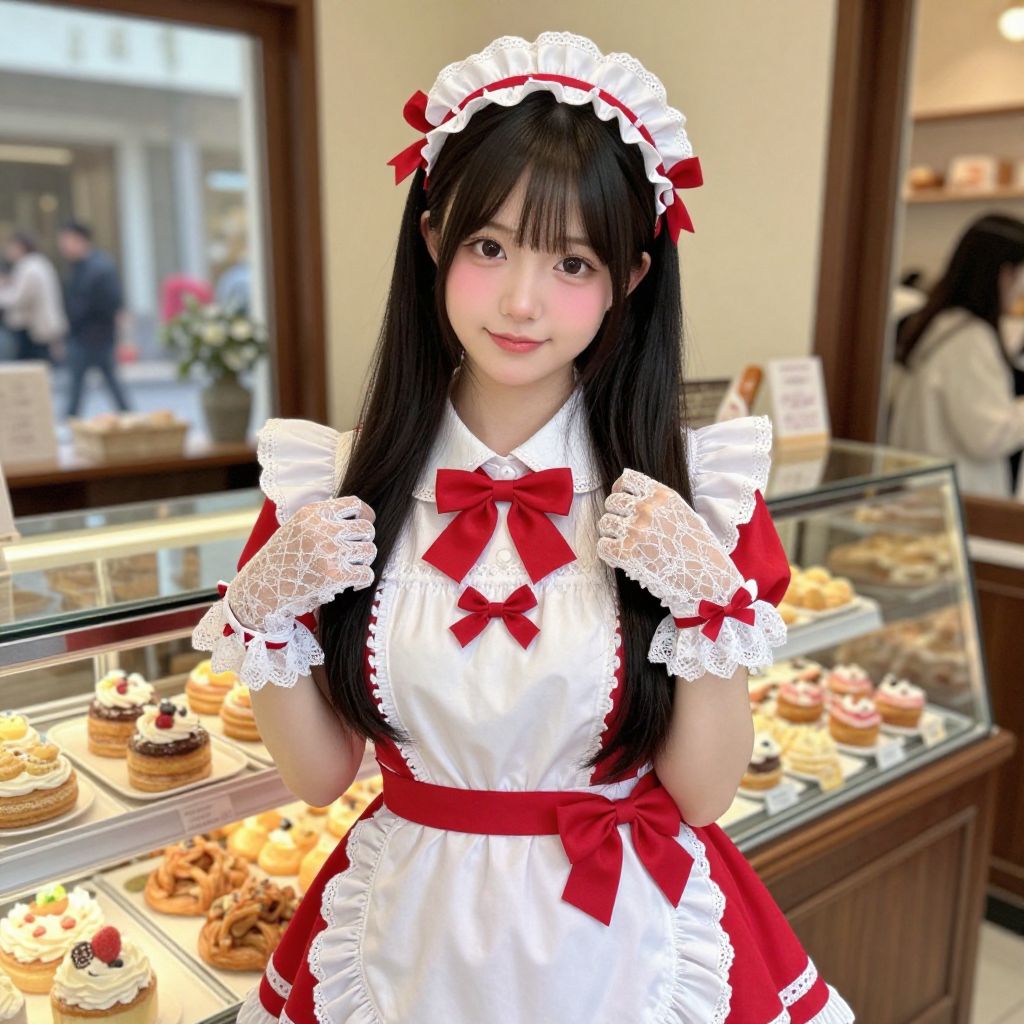 Photograph of an Asian woman with long black hair, wearing a red and white French maid outfit, standing in a bakery with a glass display of past