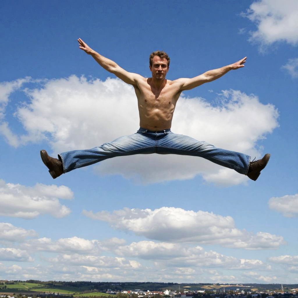 A photograph of a person mid-air, arms and legs spread out, against a clear blue sky with a few white clouds. They have long, dark hair flying back and are wearing a dark shirt and light-colored pants. The ground below is a flat, green, grassy field that stretches to the horizon. The image has a slightly surreal, high-contrast look.
