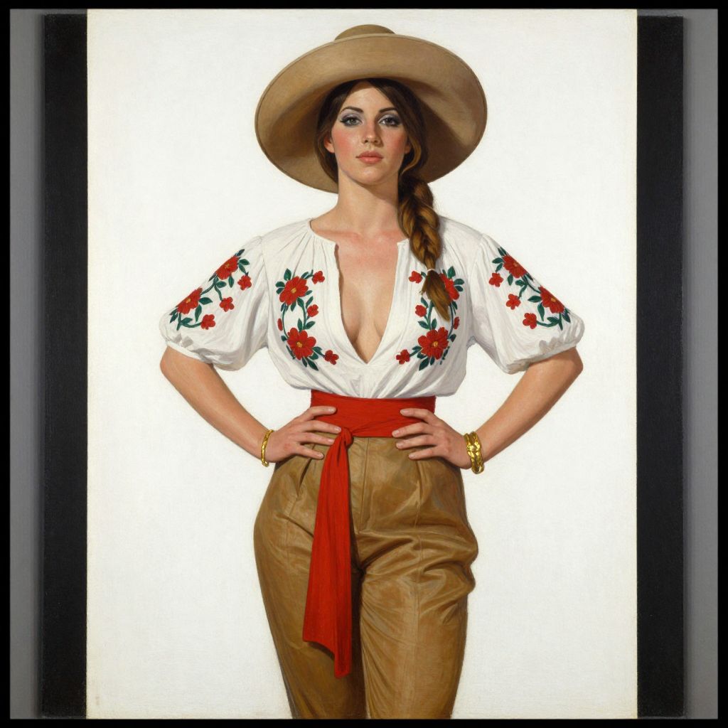 In this Gil Elvgren painting, a woman stands confidently against a stark white background, her figure adorned in a striking ensemble. She wears a wide-brimmed hat, its tan hue complementing her tan pants, which are cinched at the waist with a vibrant red sash. Her white blouse, decorated with red floral embroidery, flows elegantly, revealing a deep neckline that accentuates her décolletage. The blouse is cinched at the waist with a red belt, adding a touch of contrast to the overall earthy tones. Her hands rest on her hips, one adorned with a gold bracelet, while her hair is styled in loose waves, cascading down her back. The painting's composition is balanced, with the woman's figure centrally positioned, drawing the viewer's eye to her confident stance and the intricate details of her attire.