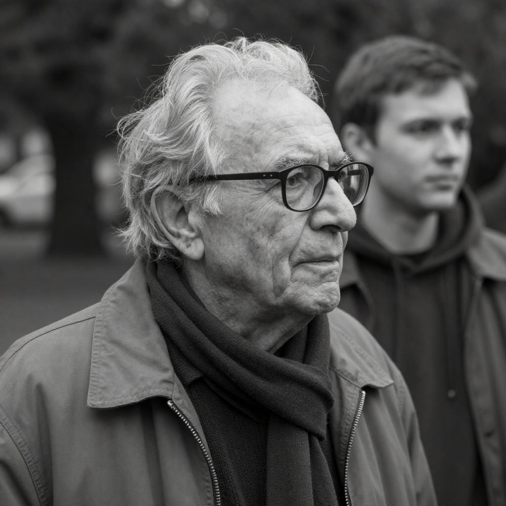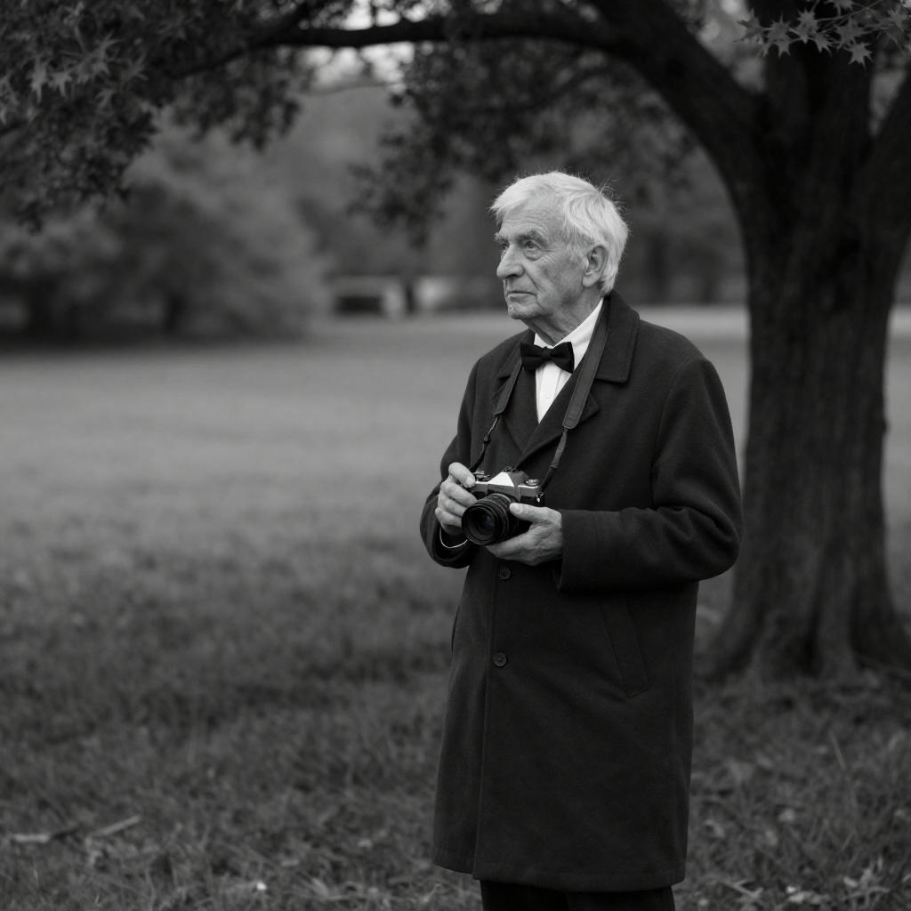 Black-and-white photograph of an elderly man with white hair, wearing a long black coat and bow tie, holding a camera. He stands under a large tree, looking to the left. Background: dark, blurred landscape. Number of people: 1.