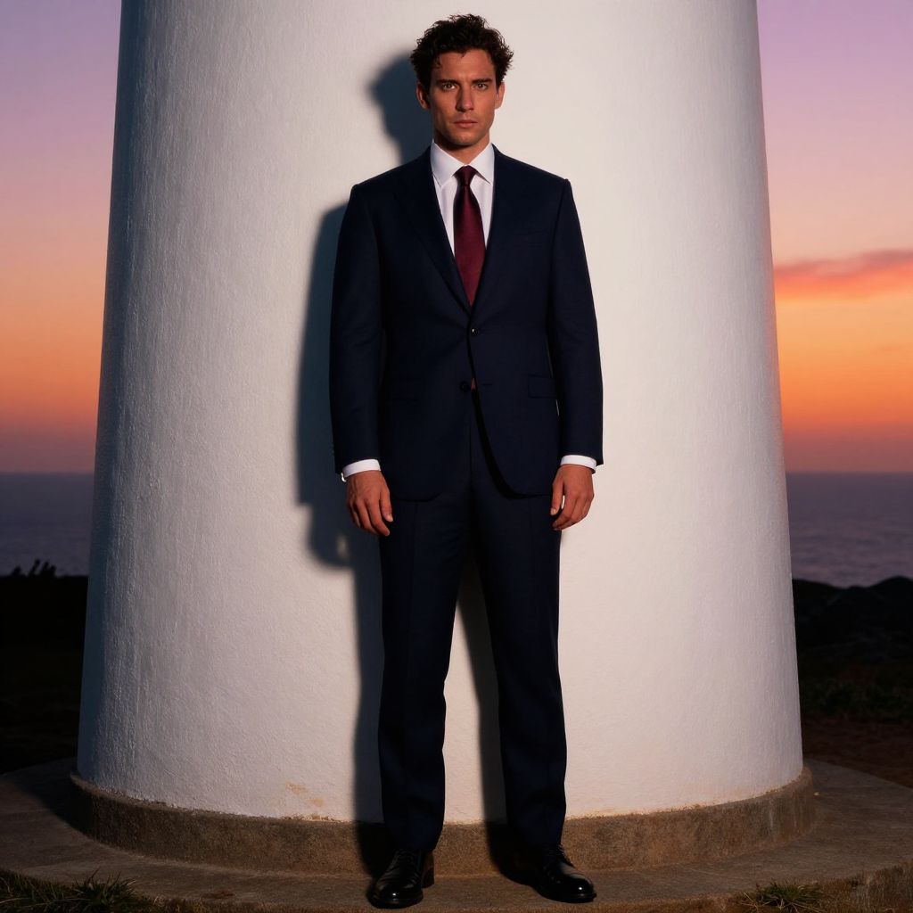 A man, navy wool single vent suit, crisp white dress shirt, silk burgundy tie, polished black leather oxford shoes, classic silver cufflinks, weathered lighthouse, vibrant sunset hues, cinematic film style, confident expression Man has masculine face and piercing eyes