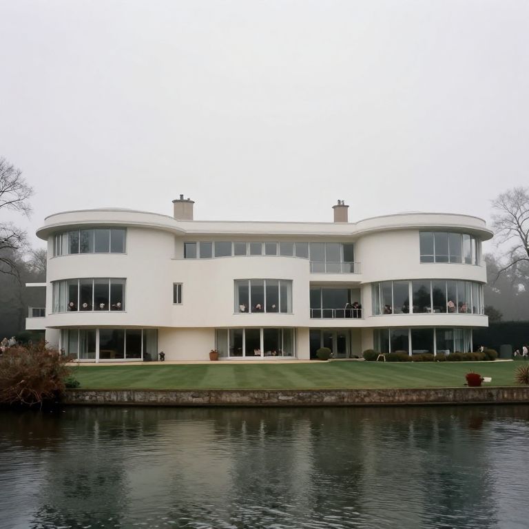 Photograph of a modern, white, two-story house with curved, rounded corners and large, floor-to-ceiling windows. The house has a flat roof and two small chimneys. It is situated by a calm, reflective pond in the foreground, with a well-manicured green lawn and a stone wall. Bare trees are visible in the background, indicating a winter or early spring setting. The overcast sky is white, contrasting with the house's bright exterior. The windows are mostly clear, with some reflections visible.
