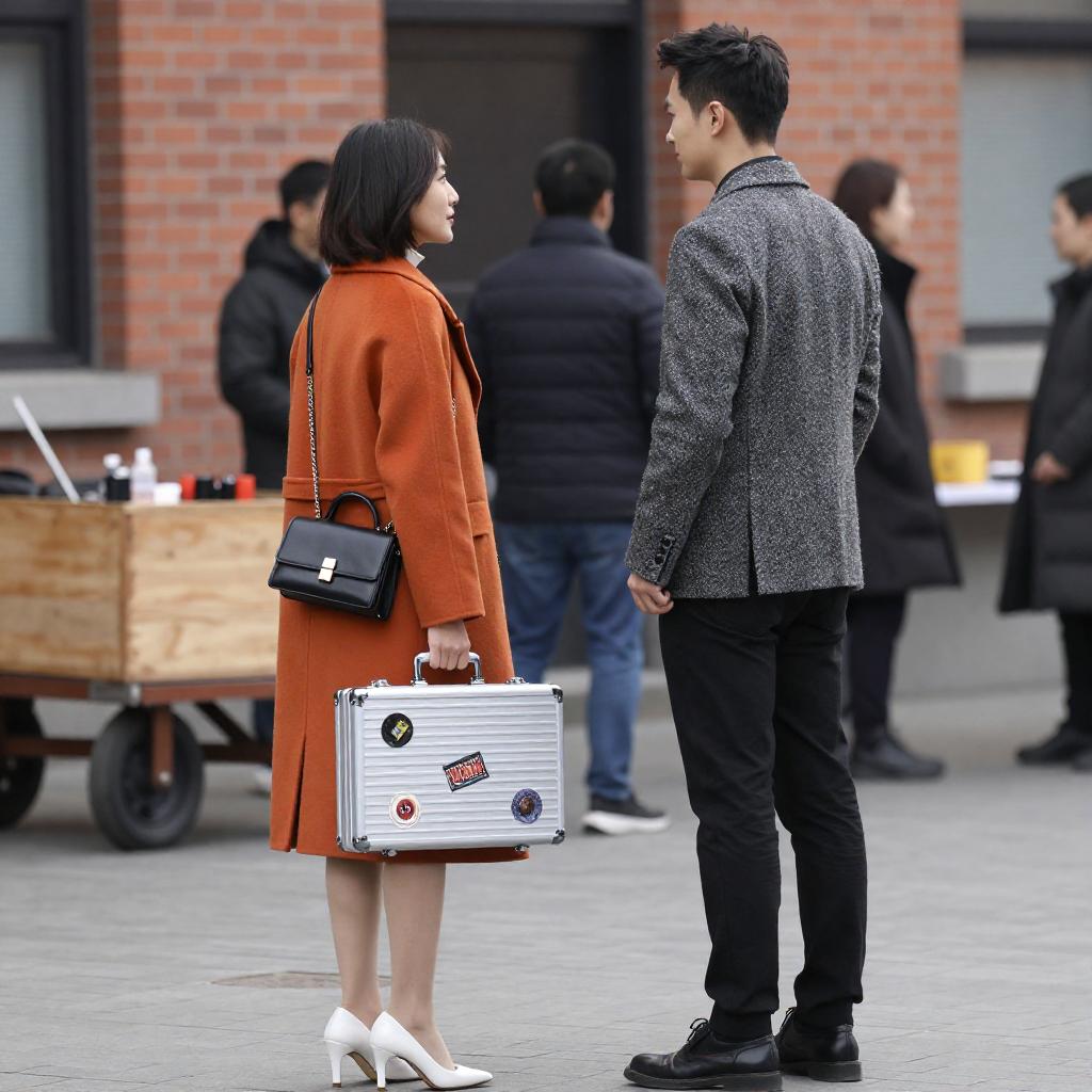 Photograph of a man and woman standing close, facing each other. The woman, with short black hair, wears an orange coat, white heels, and a black shoulder bag, holding a silver briefcase with stickers. The man, in a gray tweed jacket and black pants, looks at her. Background includes a brick building, people, and a wooden cart with tools.