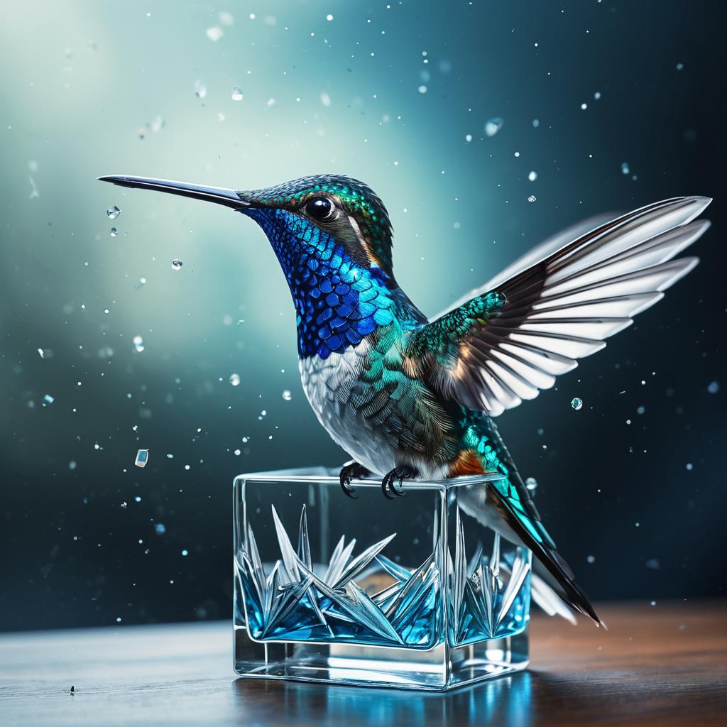 A hyper-realistic, cinematic artwork of a hummingbird crafted from glass, featuring intricate crystalline blue highlights. This abstract piece showcases the bird perched on a glass base with delicate water droplets surrounding it, emphasizing fine details and vibrant blue and green iridescence in the feathers.