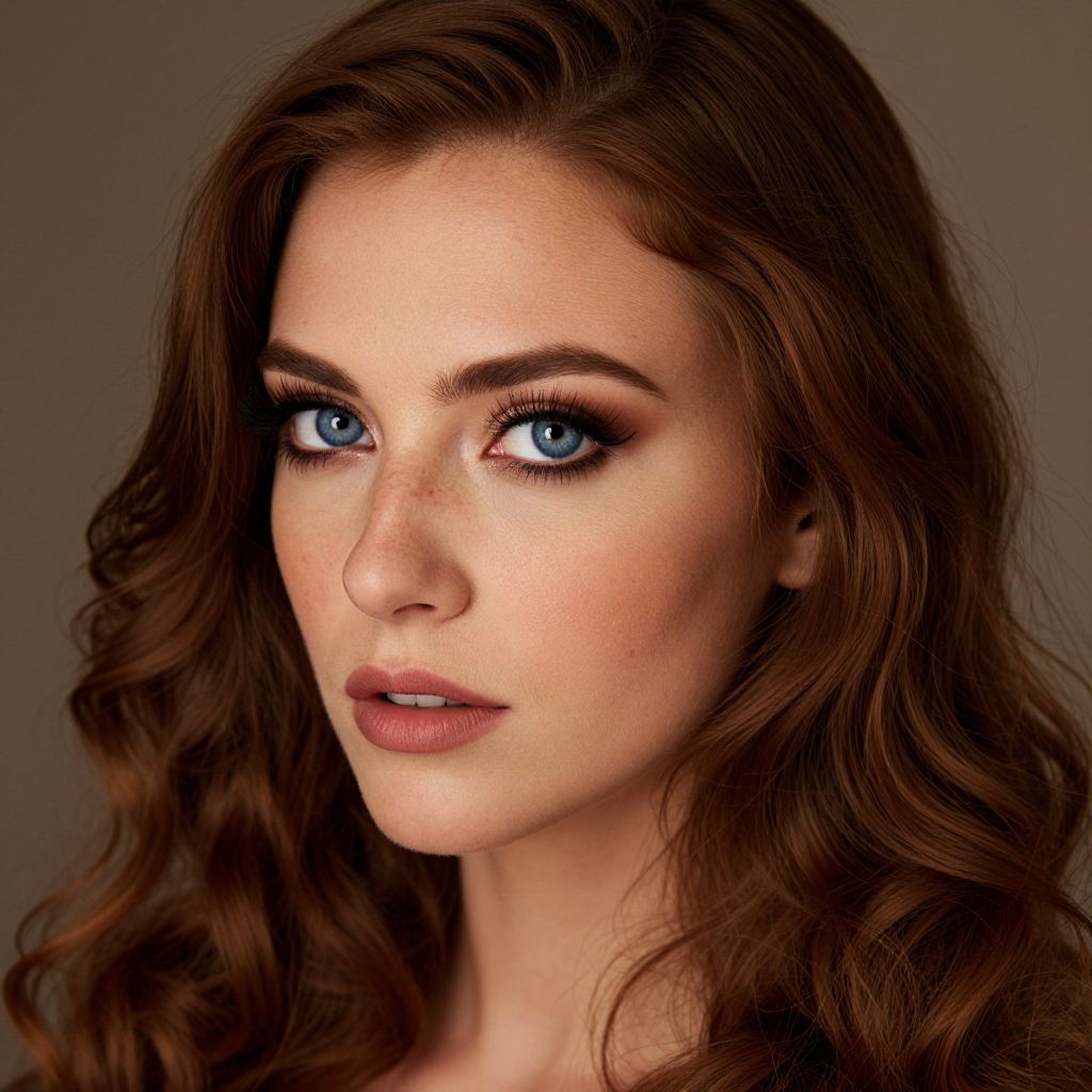 A captivating portrait of an Andean woman showcases her striking blue eyes, framed by long dark lashes and accentuated with elegant makeup that highlights her high cheekbones and full lips. Her wavy chestnut hair falls in soft waves over her shoulders, catching the light as she gazes thoughtfully into the distance from a bird's-eye perspective. Warm ambient lighting softly shadows her porcelain skin, revealing a faint scar on her right cheek and freckles across her nose, adding depth and allure to this captivating scene.