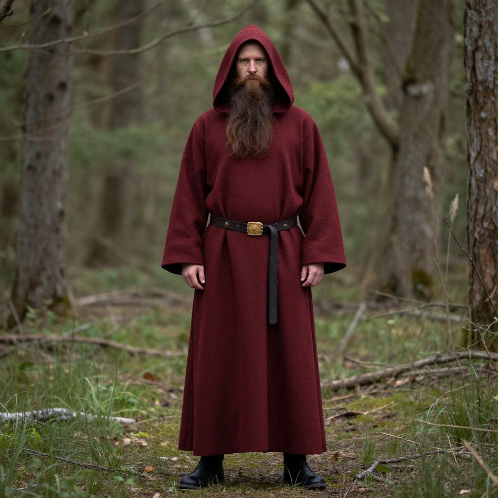 Photograph of a bearded man in a deep red hooded robe with black belt and gold buckle, standing in a forest.