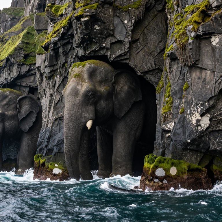 Moss-covered cliffs rise dramatically above a turbulent sea, their textured surfaces resembling colossal elephant legs, creating an illusion of ancient giants slumbering beneath the coastal landscape.