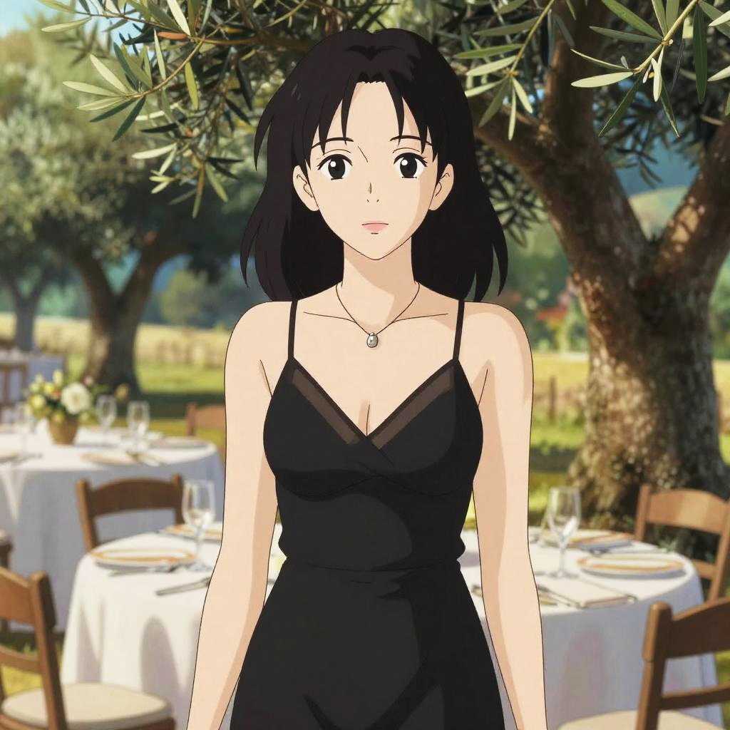 A woman, in a minimalistic chic style, wearing a sheer black slip dress with thin spaghetti straps and a V-neckline, layered over a solid black underdress, minimal jewelry with a delicate silver pendant, standing in an Italian banquet under Sicilian olive trees, in the visual style of toei animation. Sexy. Pretty face and beutiful eyes