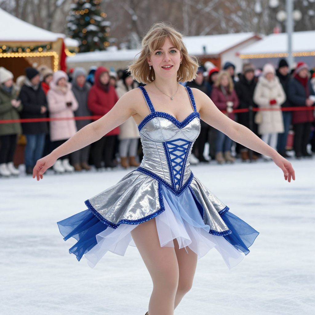 A confident and athletic woman with soft blonde hair and bright green eyes stands in a winter festival scene, wearing a detailed ice skating costume made of metallic silver and deep blue trim, with a corseted bodice and long, layered skirts that move dynamically as she dances on the ice. The background includes a crowd of festive guests and holiday decorations.. The woman has big tits and cute face