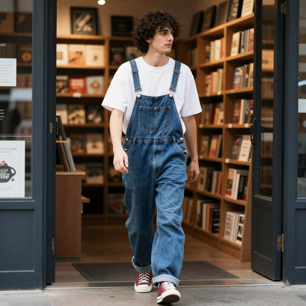 Realistic photo.A freestyle writer wearing loose-fitting overalls, walking through an indie bookstore, under orenmeric afternoon beams. realistic photo