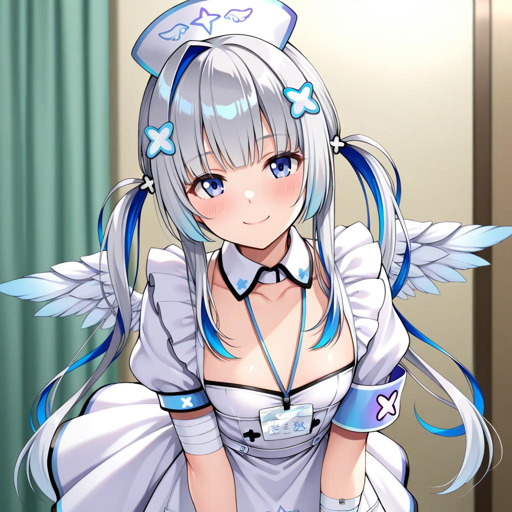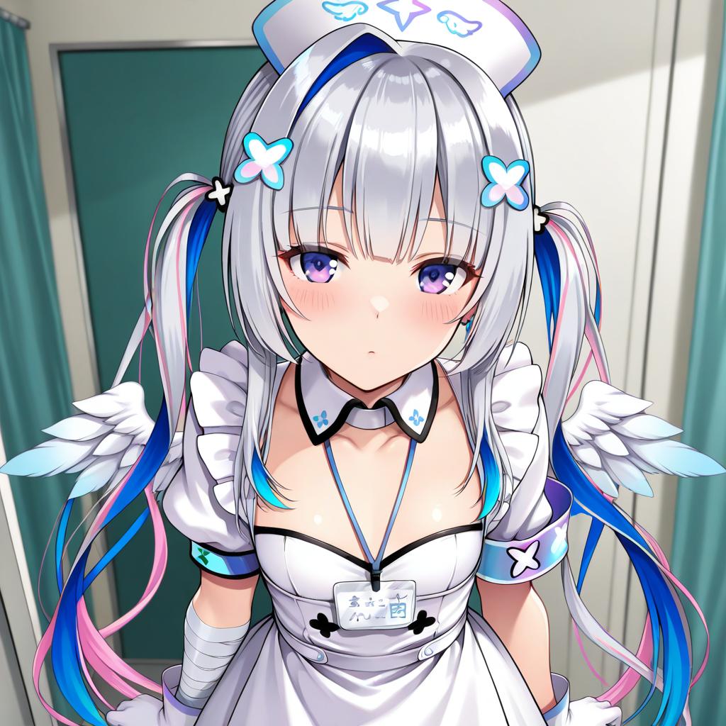 Amane kanata (nurse), hololive, 1girl, angel wings, angel wings, purple eyes, blue hair, grey hair, colored inner hair, single hair intake, official alternate hairstyle, streaked hair, official alternate hair length, long hair, pink hair, x hair ornament, twintails, blunt bangs, small breasts, flat chest, nurse cap, white gloves, white dress, white apron, detached collar, puffy short sleeves, virtual youtuber, virtual youtuber, feathered wings, feathered wings, nurse, nurse, bandaged arm, id card, armband, by artist oda ken'ichi, illustrious