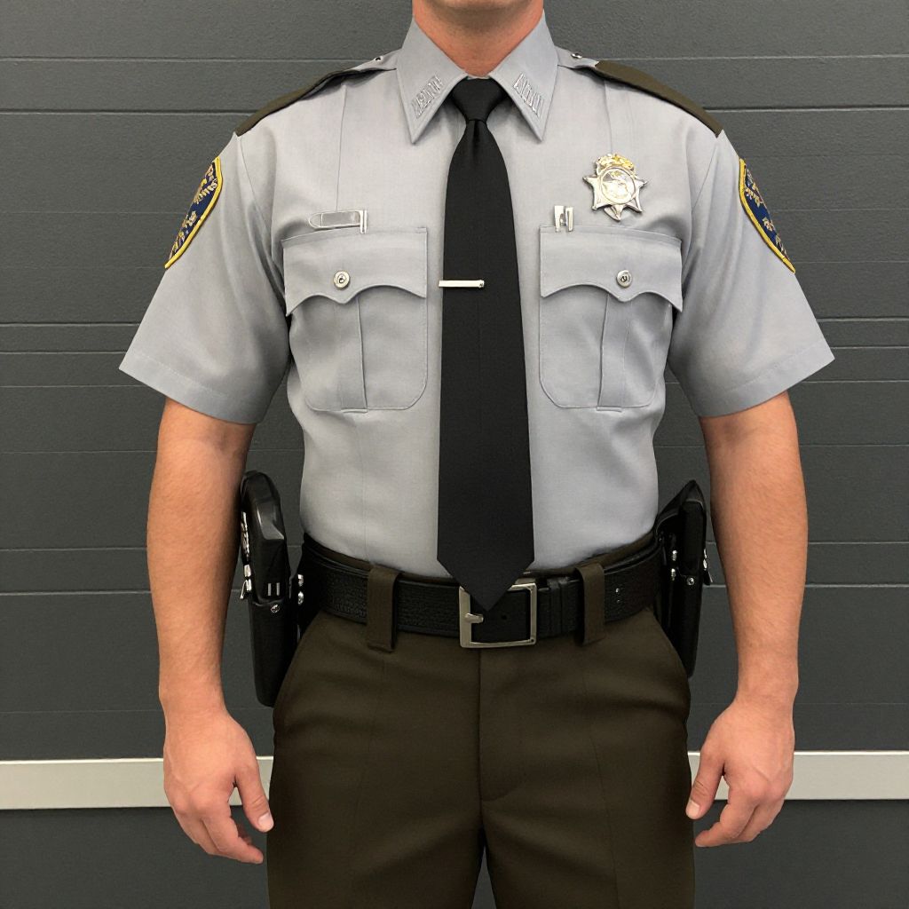 Photograph of a male police officer standing against a dark grey, horizontal-paneled wall. He wears a light grey, short-sleeved uniform shirt with black pants, a black tie, and a black utility belt with various equipment. His shirt has two chest pockets, a gold badge on the left chest, and an embroidered patch on the right sleeve. His hands are relaxed by his sides. The officer's face is not visible in the image. The uniform is crisp and well-fitted, with a professional and authoritative appearance. The lighting is even, highlighting the uniform's details and textures.