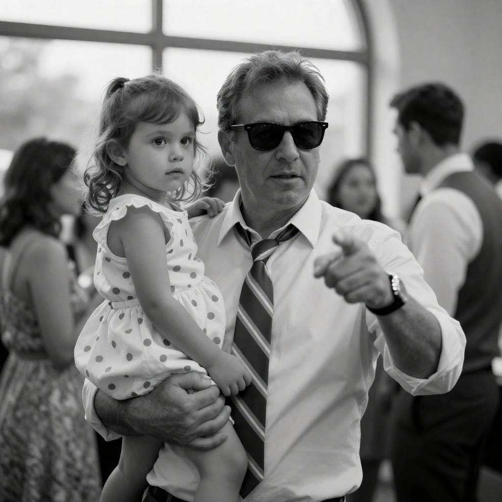 Black and white photo featuring a serious adult man in a dark shirt pointing forward with an intense expression. Beside him, a young blonde girl with a flower hair clip and a light dress sits with a neutral expression. In the background, two blurred adults stand in front of white decorative pillars with crosses, suggesting a religious or solemn setting. The man is seated on a bench with his arm resting on it.
