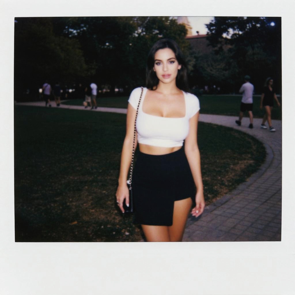 A woman in an elegant halterneck top and a contrasting black and white geometric mini skirt, captured in a polaroid instant camera style, standing at a Port market with historic buildings. Sexy. Pretty face and beаutiful eyes. Big breasts